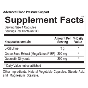 As our bodies age, blood vessels lose some elasticity and efficiency, decreasing circulation. Using powerful antioxidants Quercetin and Grape Seed Extract, plus the amino acid L-Citrulline, Advanced Blood Pressure Support helps to reduce inflammatory response in blood pathways, ensuring clear and healthy blood vessels to improve circulation and maintain healthy blood pressure levels.