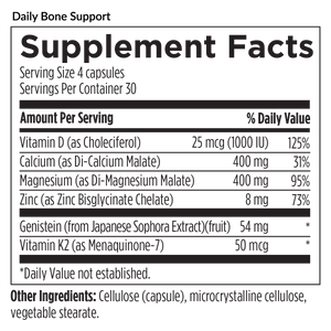 Through the aging process, bones and the skeletal system steadily lose density and strength as the body's ability to restore bone making components diminishes. Daily Bone Support provides the necessary vitamins and minerals to increase vitamin absorption, while enabling and promoting new bone construction. Daily Bone Support promotes skeletal health to keep you mobile, active and healthy no matter how old you are.