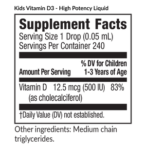 Kid's Vitamin D3 is a convenient liquid formulation for children under 50 pounds to boost immunity and support healthy development. Maintaining healthy vitamin levels for kids through diet alone can often be difficult. With a simple liquid formula, adding the all the benefits of vitamin D3 becomes quick and easy.