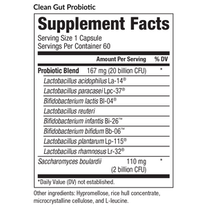 Selecting the right probiotic for you can be a complicated and tedious task. While most probiotics only provide one or two strains, the Clean Gut Probiotic provides nine strains of probiotic organisms (bacteria and beneficial fungus) to help rebalance your gut. The Clean Gut Probiotic utilizes well-researched organisms that work in symbiosis with each other and the natural strains of the gut.