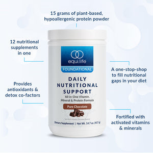 You know how important it is to fuel your body on a daily basis with the nutrients it needs to thrive. The problem is, even if you're eating healthy, it's nearly impossible to achieve optimal nutrition through food alone (even organic). This is why the EquiLife Daily Nutritional Support was formulated by Dr. Cabral. It is a vegan, hypoallergenic protein powder, fortified with a wide range of activated vitamins, minerals, antioxidants, detox co-factors, and electrolytes, making it a one-stop-shop to fill the nutritional gaps in your diet.