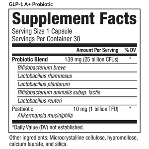 GLP-1 A+ Probiotic is a targeted formula featuring clinically studied probiotic strains that may help support a gut environment conducive to natural GLP-1 production. These specific strains may help support insulin sensitivity, blood sugar balance, appetite regulation, and metabolic efficiency. At the same time, GLP-1 A+ Probiotic works alongside herbal and nutrient-based support for the metabolism, helping to reinforce the body's natural ability to stimulate GLP-1 secretion from the gut's L-cells. This dual-action approach supports a balanced microbiome, digestive health, and sustainable metabolic wellness.