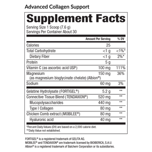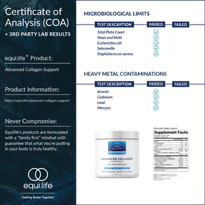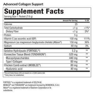 Collagen is the most abundant protein involved in the structure of connective tissues and makes up between 25-30% of the body. As with most processes, the human body produces less and less high-quality collagen as it ages. Decreases in both quality and quantity can lead to changes in joint health and function, brittle hair and nails, skin wrinkles, poor muscle recovery, and inflammatory response. The ingredients of Advanced Collagen Support help the body to replace, replenish, and repair existing tissues and promote a more youthful appearance.