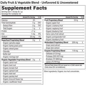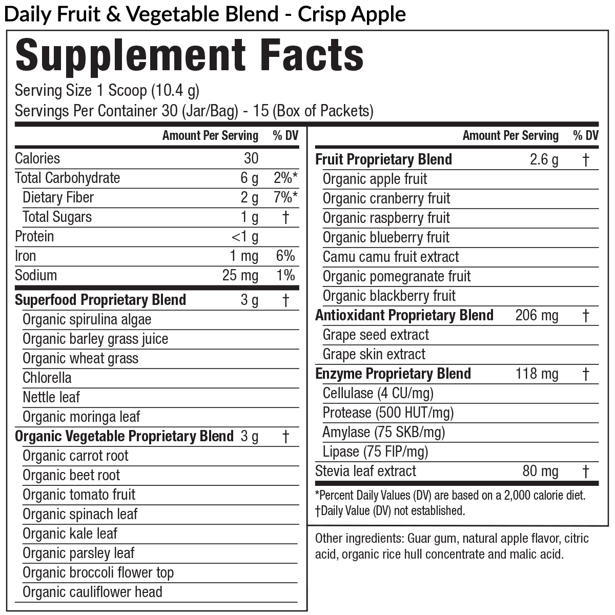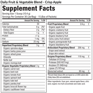 While most superfood supplement powders are green, the Daily Fruit & Vegetable Blend goes so much further to deliver greens, reds, superfoods, plus algae for antioxidants. A blend of 22 ingredients provides a variety of important nutrients and phytochemicals often hard to obtain from dietary intake alone. In addition, it adds a blend of key enzymes that support digestion, enhancing the absorption of nutrients from food, and making the process easier and more efficient overall. Daily Fruit and Vegetable Blend is bolstered by diverse superfoods including Camu Camu, a fruit grown in South America.