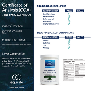 You probably know by now that you should be eating the recommended 7-9 servings of fruits and vegetables every day. The problem is, even if you eat the recommended servings on a daily basis, you're probably not getting the wide variety of colorful vegetables your body needs. The EquiLife Daily Fruit & Vegetable Blend is the simple way to ensure you get the benefits of 22 fruits and vegetables, plus antioxidants and rare superfoods that support optimal health.