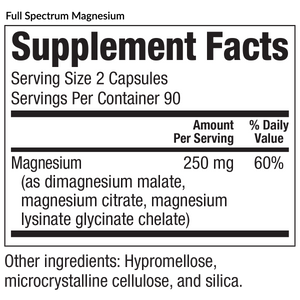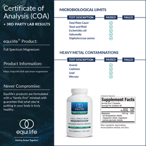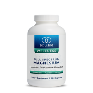 Despite the importance of magnesium, many people are deficient in this key mineral. Involved in over 300 biological processes in the body -- supplementation ensures that your body will be well balanced. Optimal levels help with regulating sleep, improving mental clarity, aiding muscle relaxation, maintaining healthy blood pressure, bone formation, protein synthesis, and antioxidant production. Many supplements use magnesium oxide, a form which is not as easily absorbed. Preferred forms include dimagnesium malate, magnesium citrate, or magnesium lysinate. By selecting the most bioavailable forms, EquiLife's Full Spectrum Magnesium assists the body to efficiently absorb and utilize this essential mineral.