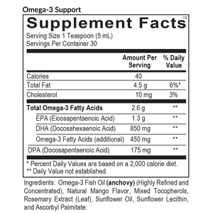 Modern diets tend to have an unfavorable ratio of Omega-3 to Omega-6 fatty acids. Without providing the body with sufficient Omega-3s, the body can present a variety of challenges. Omega-3 Support provides a liquid formula of high-quality fish oil. Sustainably sourced from wild fish and naturally flavored with mango to make supplementation easy, Omega-3 Support is a great way to add the heart health and inflammation-modulating benefits of fish oil to your diet.