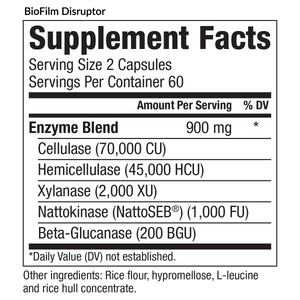 Biofilms are formed by colonies of bacteria and fungus, much like dental plaque. These thin layers of lipids adhere to each other and to the gut lining. Unwanted strains of bacteria and fungus can take harbor and evade natural elimination by the immune system by hiding in a biofilm. BioFilm Disruptor delivers a targeted set of enzymes formulated to dissolve and break up biofilms, without disrupting regular gut function.