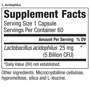 Adding the benefits of beneficial probiotics is an important aspect of healthy digestion, yet many probiotics contain dairy which can be counter-productive. Our L. Acidophilus provides a dairy-free dose of powerful probiotics that supports healthy digestion, maintains microflora balance, and can help reduce bloating and gas.