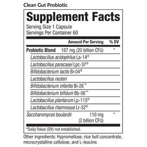Selecting the right probiotic for you can be a complicated and tedious task. While most probiotics only provide one or two strains, the Clean Gut Probiotic provides nine strains of probiotic organisms (bacteria and beneficial fungus) to help rebalance your gut. The Clean Gut Probiotic utilizes well-researched organisms that work in symbiosis with each other and the natural strains of the gut.
