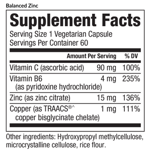 Maintaining a healthy immune system is best achieved with the powerful mineral zinc, but long-term use often depletes the body's natural copper levels. Balanced Zinc is a unique formulation for robust immunity, tissue development, and repair that includes important co-factors such as copper that allow for long-term use.