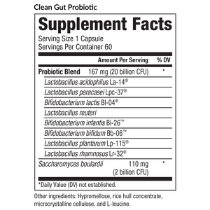 Selecting the right probiotic for you can be a complicated and tedious task. While most probiotics only provide one or two strains, the Clean Gut Probiotic provides nine strains of probiotic organisms (bacteria and beneficial fungus) to help rebalance your gut. The Clean Gut Probiotic utilizes well-researched organisms that work in symbiosis with each other and the natural strains of the gut.