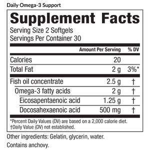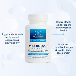 Omega-3 fatty acids are essential for healthy nutrition, yet obtaining high-quality sources through diet alone can be challenging. Omega-3 Support by EquiLife provides 2.5g of sustainably sourced, and superior triglyceride formulated fish oil for enhanced absorption. With Omega-3 Support, modulating inflammation, supporting a healthy heart and brain is not only good for you but also good for the planet.