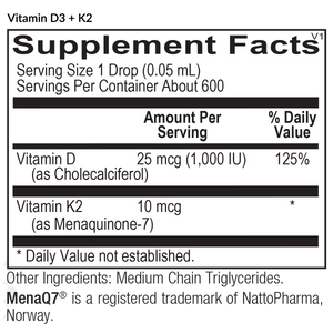 Increasing research is now showing that a synergistic relationship exists between Vitamin D3 and Vitamin K (specifically, Vitamin K2) when it comes to supporting bone strength and cardiovascular health. In order to provide these exciting benefits, we have combined liquid Vitamin D3 + K2 in a high-potency formula. Vitamin D3 and K2 are both naturally occurring and structurally similar fat soluble vitamins, which share similar qualities and act synergistically within the body.